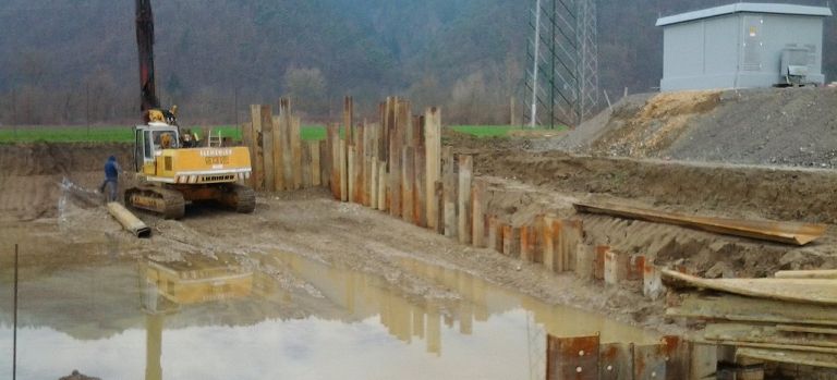 Čistilna naprava v Litiji – varovanje gradbene jame z zagatnicami Jeklene zagatne stene, zagatnice in AB piloti in sidranje